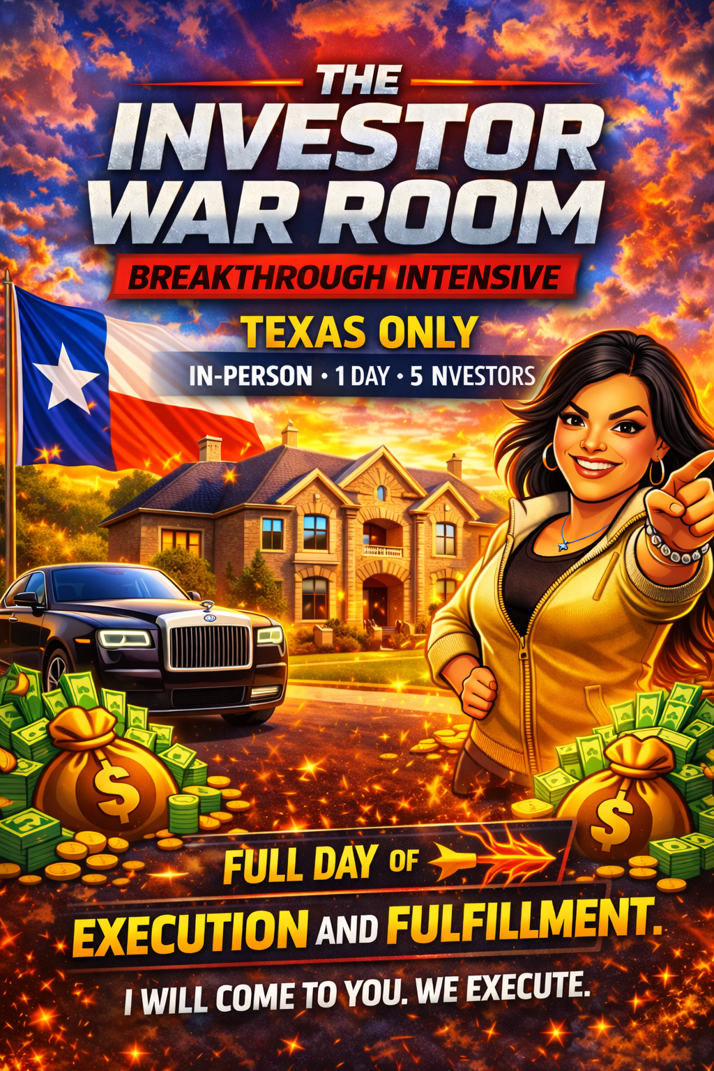 Texas-Only: The Investor War Room is a private, in-person, full-spectrum real estate execution intensive where I come to you anywhere in Texas. One full day. Five serious investors. Flipping, creative finance, funding, building, exits—we design real capital moves. No fluff. Just strategy, structure, and momentum. Full day of execution and fulfillment. When the room fills, it closes.